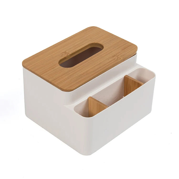 | The paper towel box is made of white plastic - with lid made of natural bamboo. |